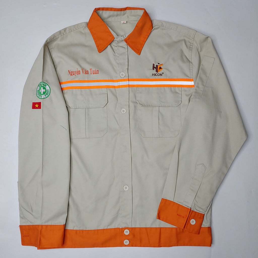 🔹 Kiểu dáng: Áo dài tay, cổ bẻ phối cam nổi bật, lai và tay áo bo cam khỏe khoắn. Logo HICON thêu ngực trái, tên cá nhân thêu ngực phải, cờ Việt Nam và logo an toàn may bên tay trái.