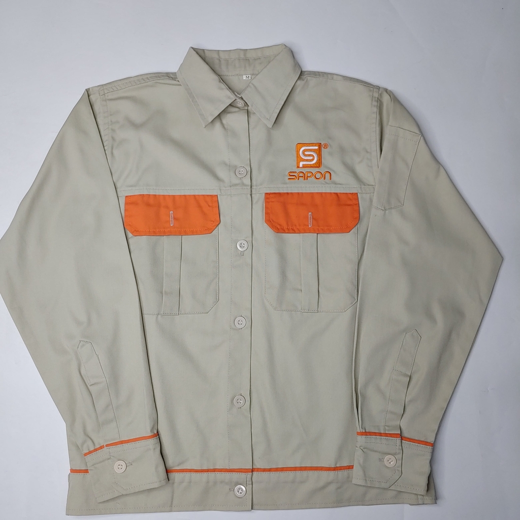 🔹 Kiểu dáng: Áo bảo hộ dài tay, cổ bẻ đứng dáng, phối lé cam nổi bật ở túi ngực và viền tay. Logo SAPON thêu ngực trái sắc nét, tăng tính nhận diện thương hiệu.